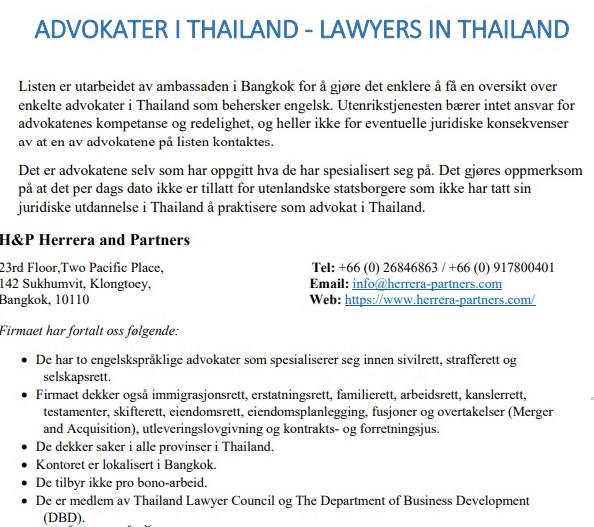 Esta semana de noviembre de 2020, H&P se enorgullece de ser reconocido en el sitio web del Ministerio de Relaciones Exteriores de Noruega por nuestro trabajo profesional para personas y empresas noruegas en Bangkok, como se refleja en la lista elaborada por la Embajada de Noruega en Tailandia para el Ministerio de Relaciones Exteriores de Noruega.